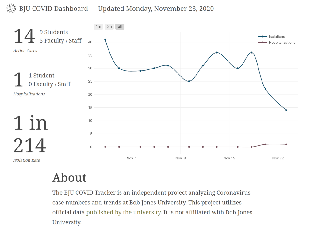 An independent project analyzing Coronavirus case numbers and trends at Bob Jones University, utilizing official data published by the university.