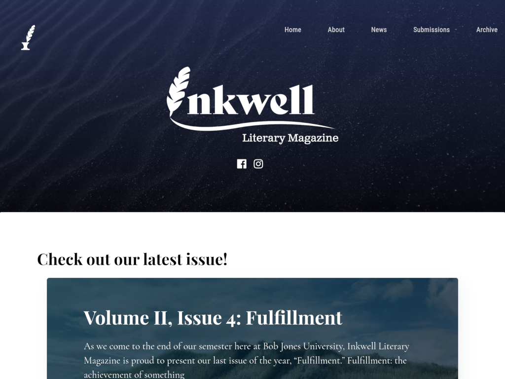 Inkwell exists to provide writers in the Bob Jones University community a place of artistic collaboration and review, and a platform to share their works. The publication works to provide those desiring to pursue a career in creative writing with opportunities to work with a literary publication as writers and editors. They produce quality creative work including short stories, poetry, and creative non-fiction on a monthly basis.